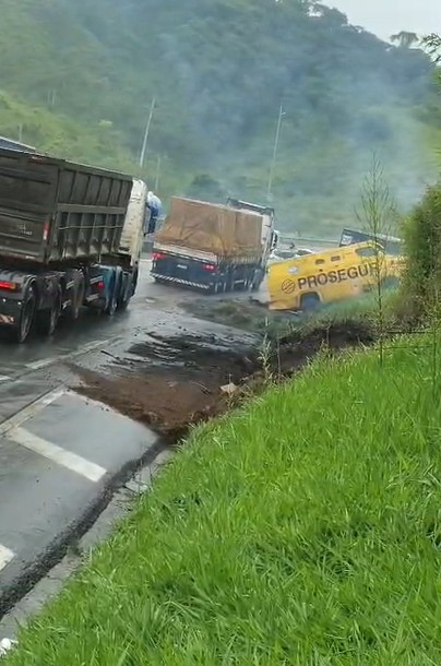 De acordo com informações iniciais da Polícia Rodoviária Federal (PRF), o motorista do veículo teria perdido o controle da direção por causa da pista molhada. O carro-forte atingiu a mureta central que divide as pistas, saiu da rodovia, colidiu contra um barranco, tombou e, em seguida, pegou fogo.